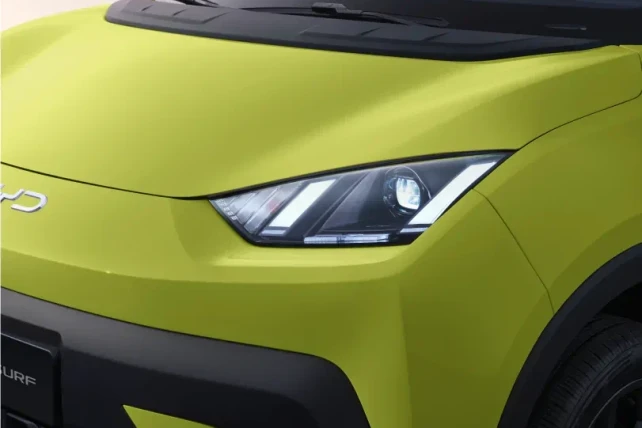 The BYD Dolphin Surf is equipped with sleek, sharply defined headlights made up of six angled light elements. It also includes daytime running lights, giving the compact electric car a refined and modern appearance.